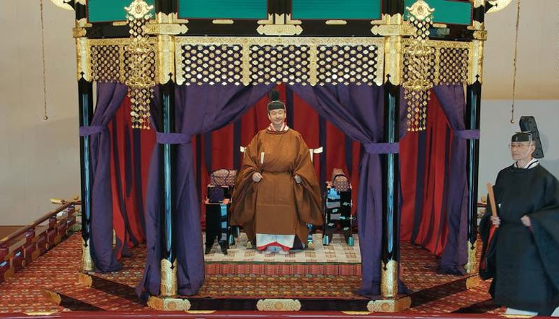 Nhà vua mặc áo choàng trắng, đội mũ đen khi thực hiện nghi lễ trước sự chứng kiến của các thành viên Hoàng gia và các chính trị gia hàng đầu đất nước, trong đó có Thủ tướng Nhật Shinzo Abe.