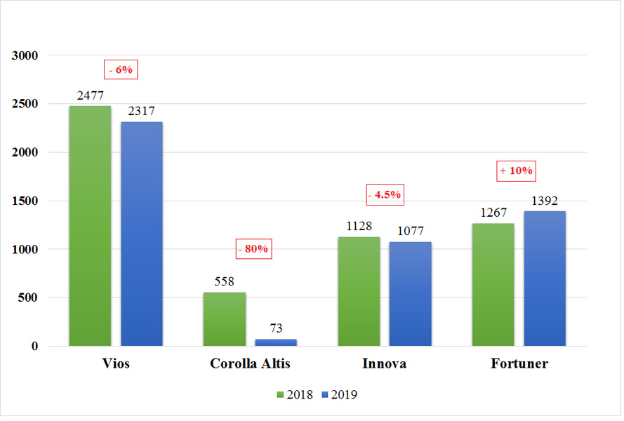 Tháng 10/2019; tổng lượng xe CKD chiếm 62% doanh số TMV với 4.475 xe. Toyota Vios đạt doanh số bán 2.317 xe, lượng bán giảm 6% so với cùng kỳ năm ngoái, là mẫu xe đứng thứ 02 về doanh số trong toàn thị trường. Corolla Altis chỉ bán được 73 xe, giảm 80% và Innova đạt 1.077 xe, chỉ giảm nhẹ 4.5% so với cùng kỳ năm 2018.