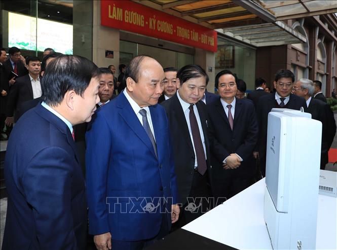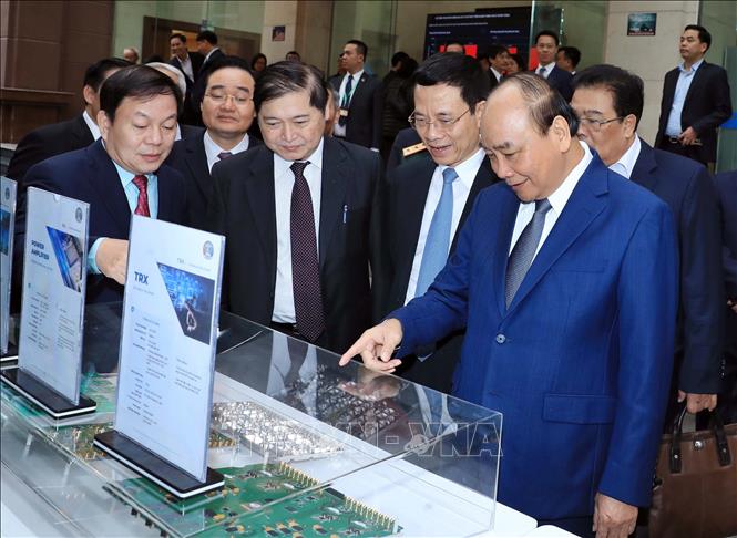 Thủ tướng Nguyễn Xuân Phúc và các đại biểu khu trưng bày thiết bị 5G của Tập đoàn công nghiệp – viễn thông Viettel.