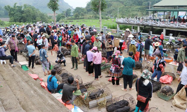 Khu vực chợ lợn San Thàng nhộn nhịp người bán, người mua. Ảnh: Nguyễn Oanh/TTXVN.